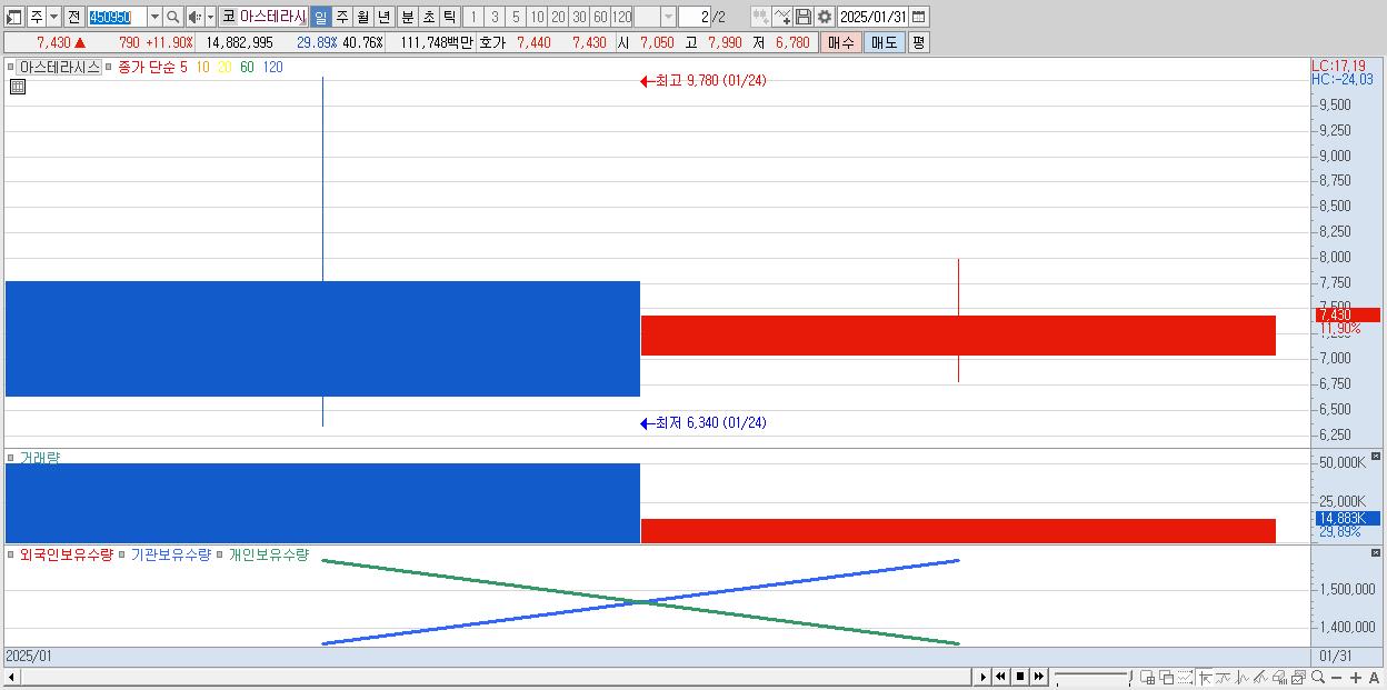 - 아스테라시스 (7,430원 ▲ 11.9% , 시총: 2,713억, 거래량: 14,882,995, 거래대금:1,117억)