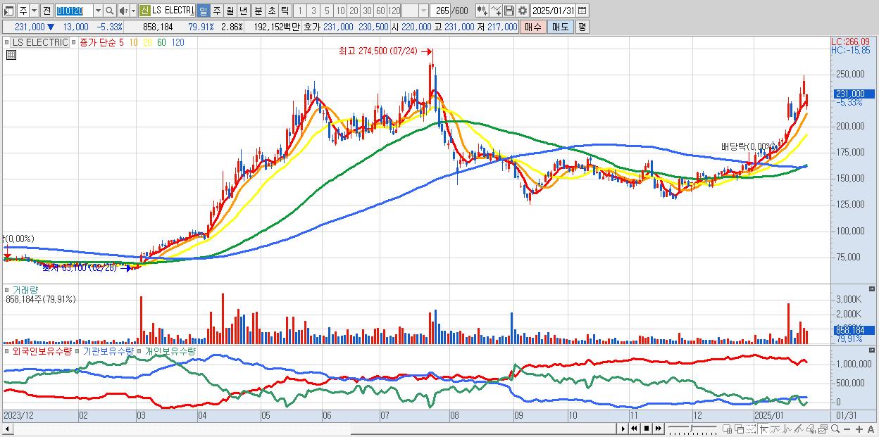 - LS ELECTRIC (231,000원 ▼ -5.33% , 시총: 69,300억, 거래량: 858,184, 거래대금:1,922억)