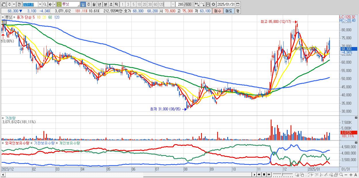- 루닛 (68,300원 ▼ -4.34% , 시총: 19,768억, 거래량: 3,071,612, 거래대금:2,126억)