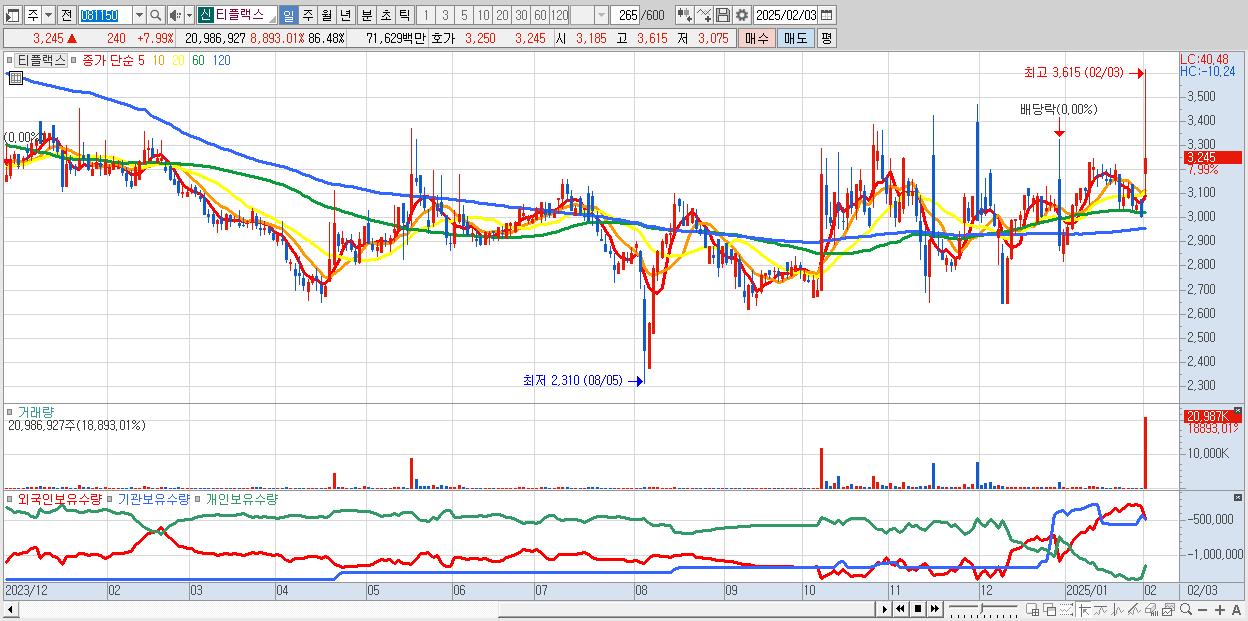 - 티플랙스 (3,245원 ▲ 7.99% , 시총: 788억, 거래량: 20,986,927, 거래대금:716억)