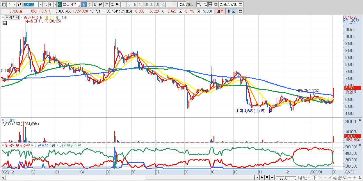 - 브리지텍 (6,330원 ▲ 15.51% , 시총: 757억, 거래량: 5,830,463, 거래대금:365억)