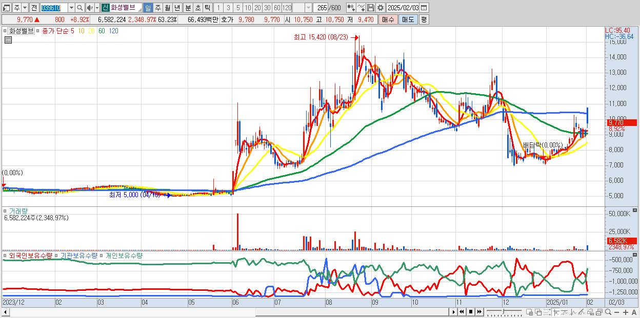 - 화성밸브 (9,770원 ▲ 8.92% , 시총: 1,017억, 거래량: 6,582,224, 거래대금:665억)