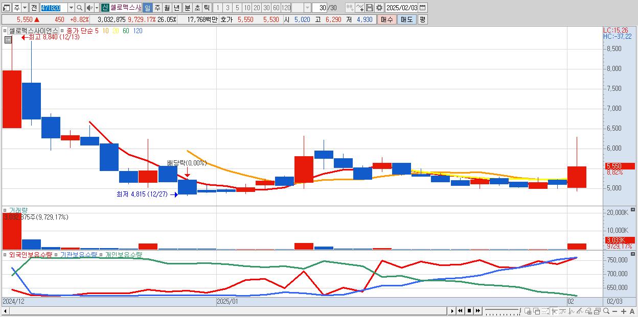 - 셀로맥스사이언스 (5,550원 ▲ 8.82% , 시총: 646억, 거래량: 3,032,875, 거래대금:178억)