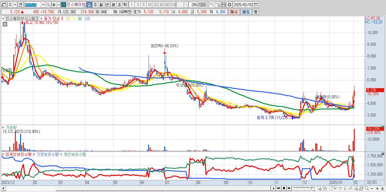 - 인스웨이브시스템즈 (5,120원 ▲ 10.7% , 시총: 753억, 거래량: 19,122,302, 거래대금:982억)