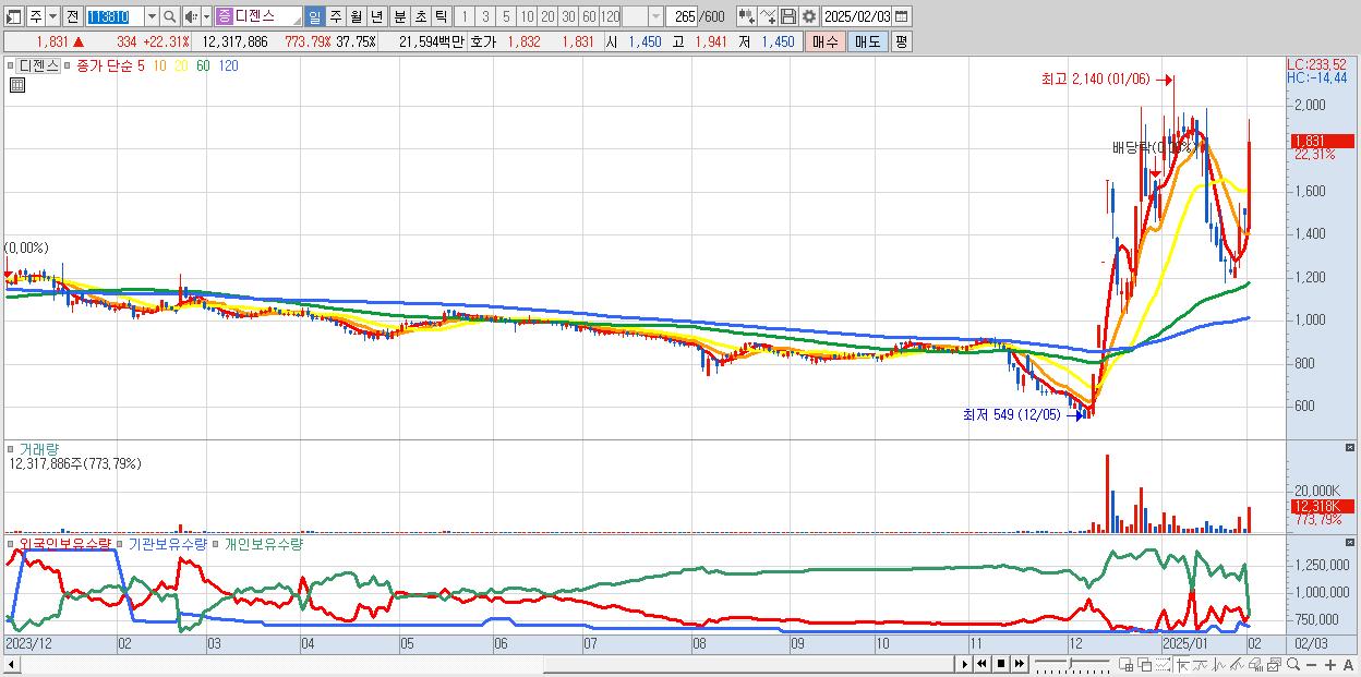 - 디젠스 (1,831원 ▲ 22.31% , 시총: 597억, 거래량: 12,317,886, 거래대금:216억)
