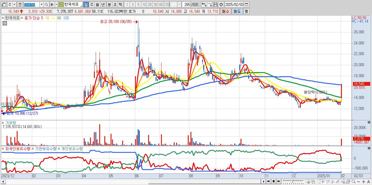 - 한국석유 (16,540원 ▲ 29.93% , 시총: 2,100억, 거래량: 7,376,937, 거래대금:1,160억)