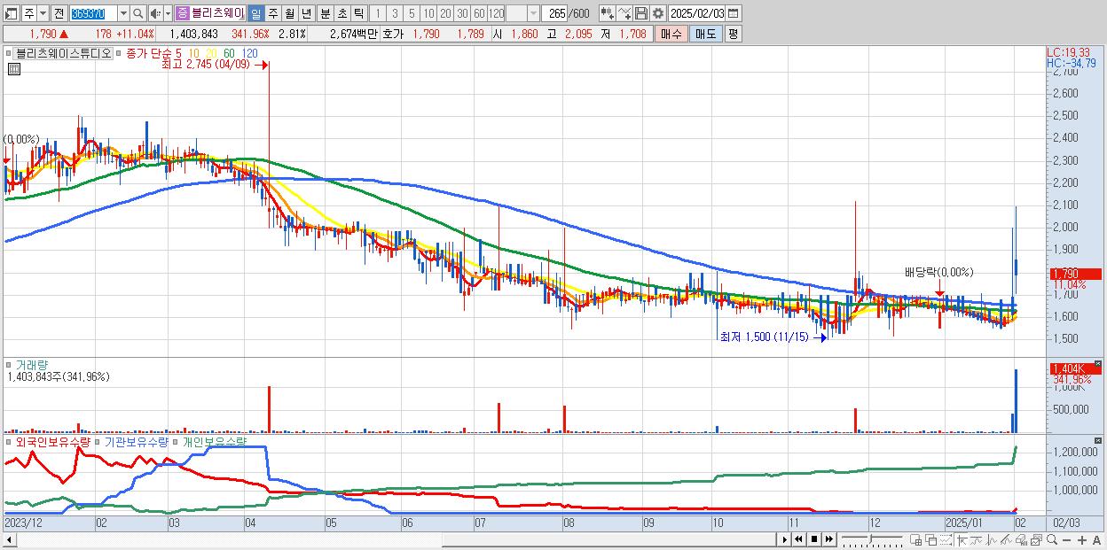 - 블리츠웨이스튜디오 (1,790원 ▲ 11.04% , 시총: 893억, 거래량: 1,403,843, 거래대금:27억)