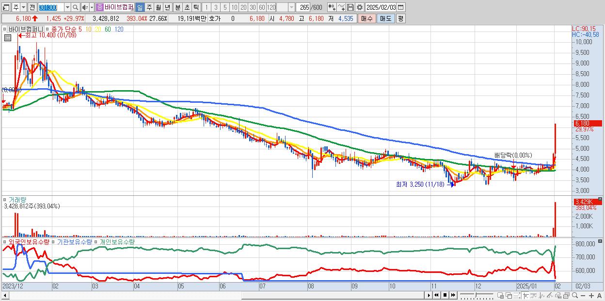 - 바이브컴퍼니 (6,180원 ▲ 29.97% , 시총: 766억, 거래량: 3,428,812, 거래대금:192억)