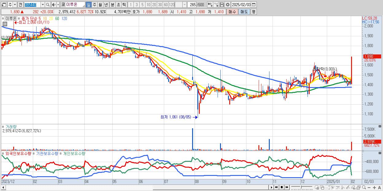 - 이루온 (1,690원 ▲ 20.03% , 시총: 461억, 거래량: 2,979,412, 거래대금:47억)