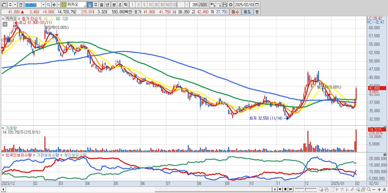 - 카카오 (41,800원 ▲ 9% , 시총: 185,451억, 거래량: 14,720,792, 거래대금:5,939억)