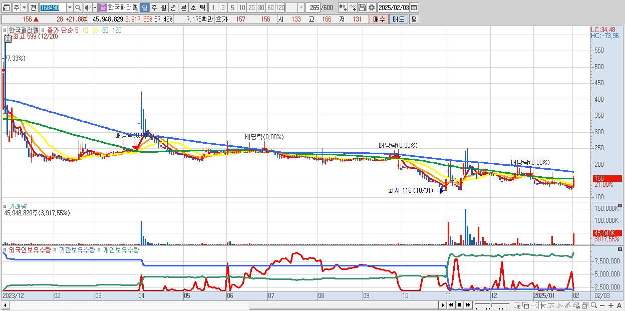 - 한국패러랠 (156원 ▲ 21.88% , 시총: 125억, 거래량: 45,948,829, 거래대금:72억)