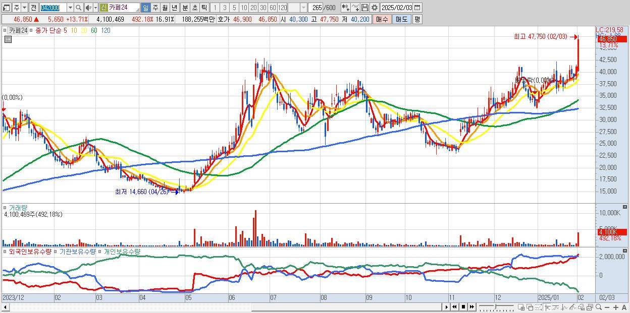 - 카페24 (46,850원 ▲ 13.71% , 시총: 11,363억, 거래량: 4,100,469, 거래대금:1,883억)