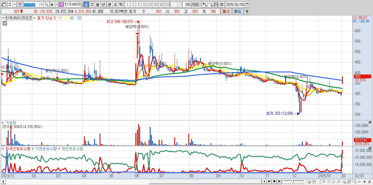 - 한국ANKOR유전 (383원 ▲ 29.83% , 시총: 268억, 거래량: 29,672,504, 거래대금:109억)