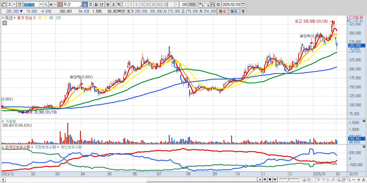 - 두산 (265,000원 ▼ -6.69% , 시총: 43,788억, 외국인 순매수 거래금:206억)