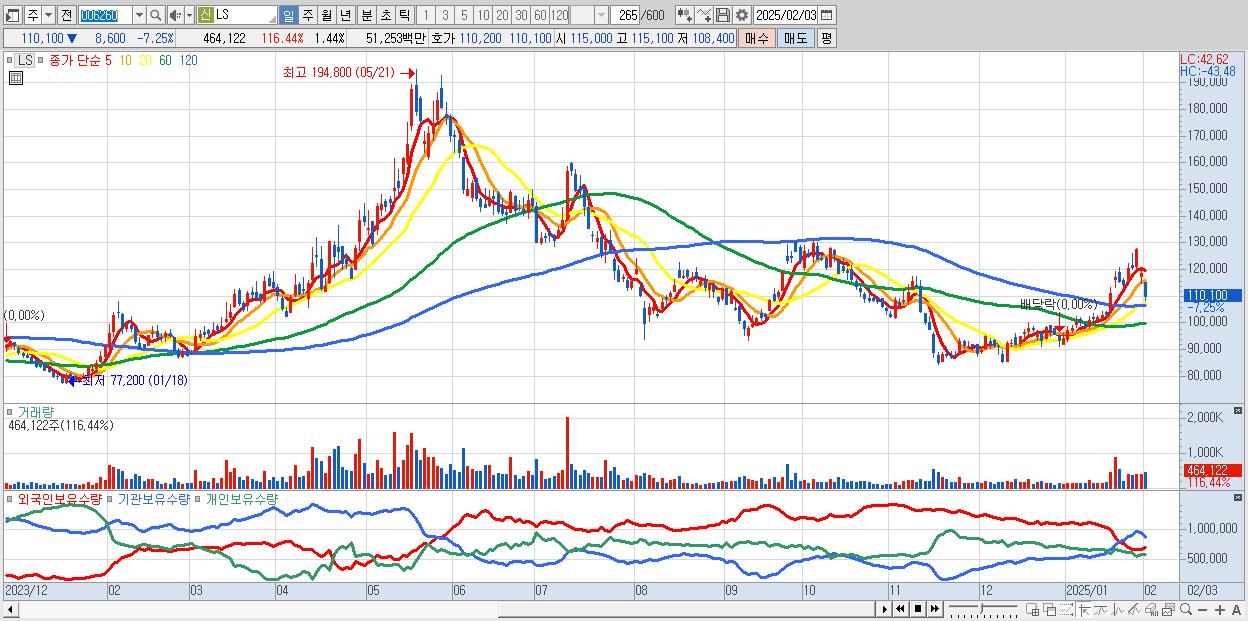 - LS (110,100원 ▼ -7.25% , 시총: 35,452억, 외국인 순매수 거래금:39억)
