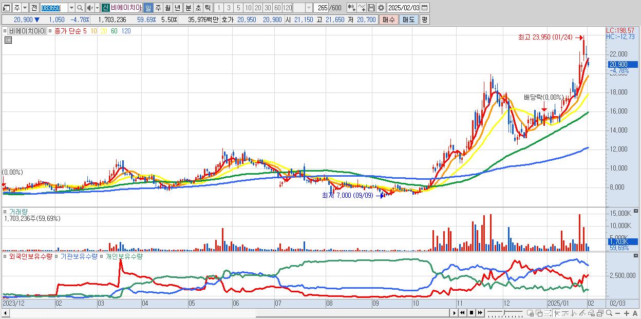 - 비에이치아이 (20,900원 ▼ -4.78% , 시총: 6,467억, 외국인 순매수 거래금:40억)