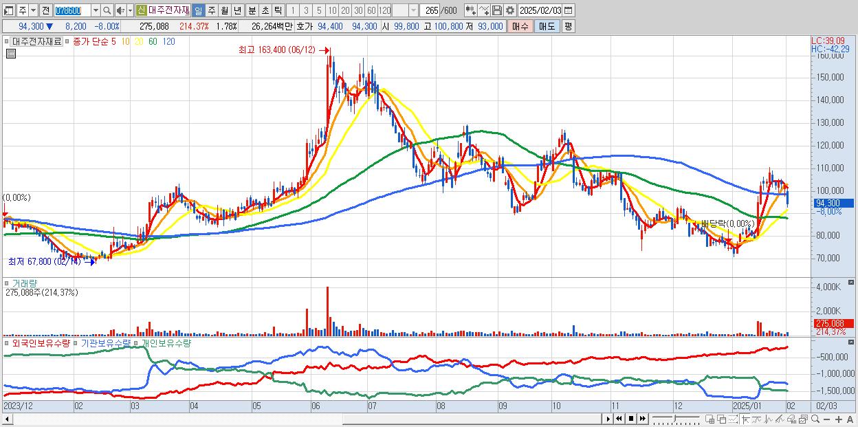 - 대주전자재료 (94,300원 ▼ -8% , 시총: 14,598억, 외국인 순매수 거래금:45억)