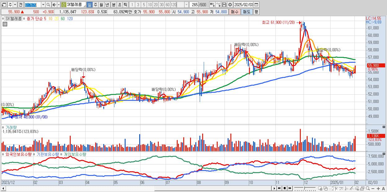 - SK텔레콤 (55,900원 ▲ 0.9% , 시총: 120,068억, 외국인 순매수 거래금:69억)