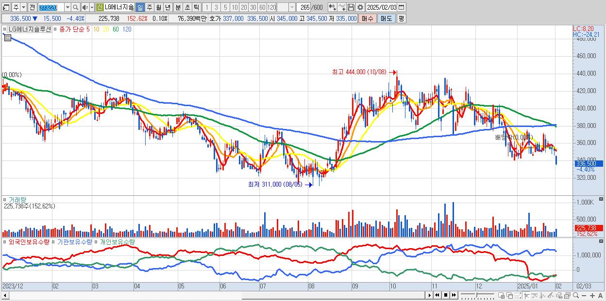 - LG에너지솔루션 (336,500원 ▼ -4.4% , 시총: 787,410억, 외국인 순매수 거래금:76억)