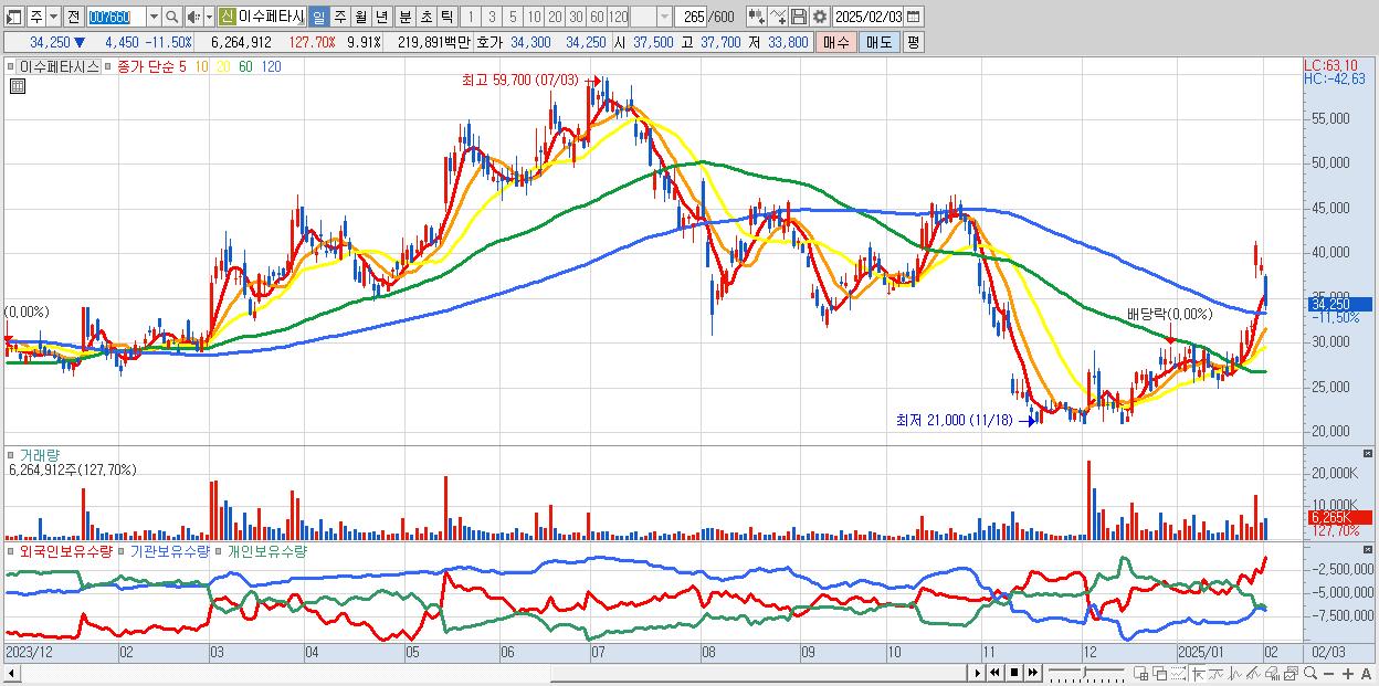 - 이수페타시스 (34,250원 ▼ -11.5% , 시총: 21,662억, 외국인 순매수 거래금:312억)