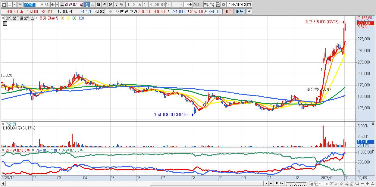 - 레인보우로보틱스 (309,500원 ▲ 3.34% , 시총: 60,043억, 외국인 순매수 거래금:117억)