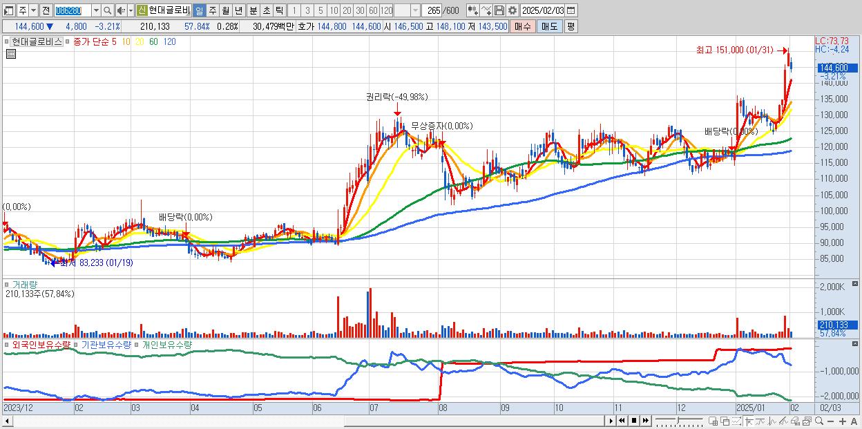 - 현대글로비스 (144,600원 ▼ -3.21% , 시총: 108,450억, 외국인 순매수 거래금:58억)