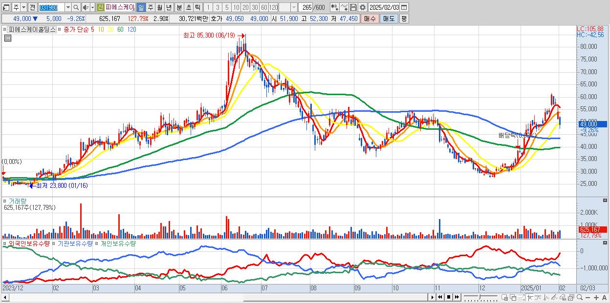 - 피에스케이홀딩스 (49,000원 ▼ -9.26% , 시총: 10,566억, 외국인 순매수 거래금:70억)