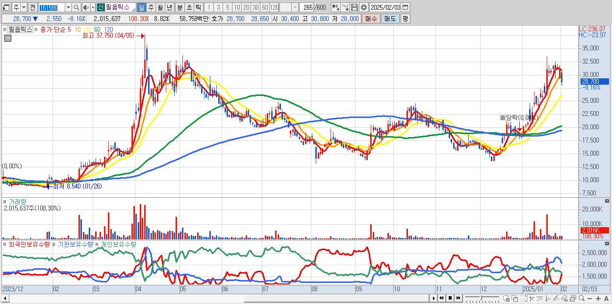 - 필옵틱스 (28,700원 ▼ -8.16% , 시총: 6,558억, 외국인 순매수 거래금:60억)