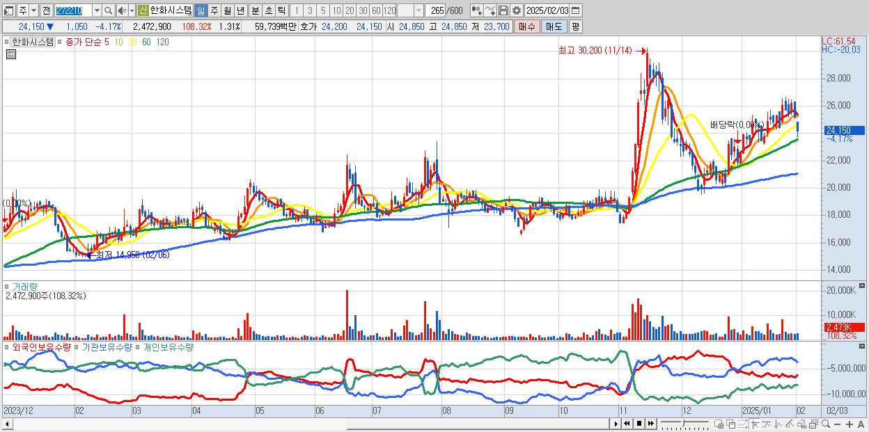 - 한화시스템 (24,150원 ▼ -4.17% , 시총: 45,624억, 외국인 순매수 거래금:81억)