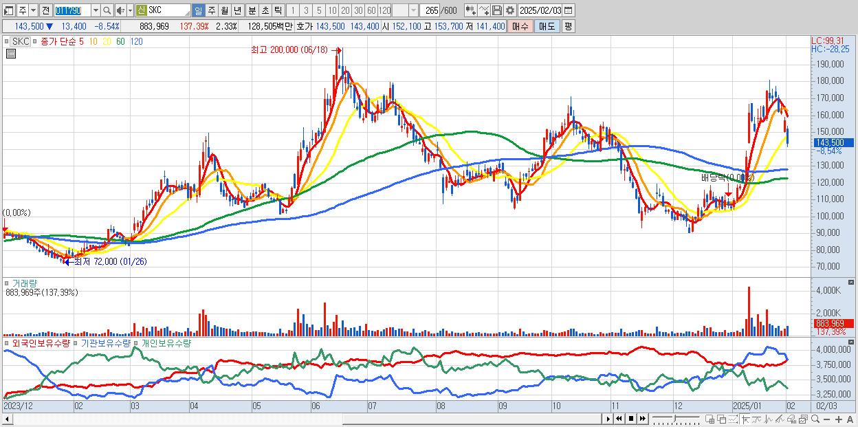 - SKC (143,500원 ▼ -8.54% , 시총: 54,341억, 외국인 순매수 거래금:159억)