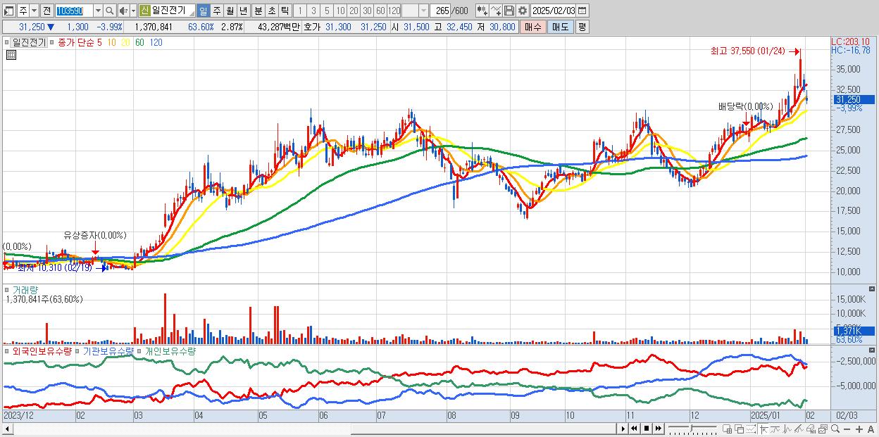 - 일진전기 (31,250원 ▼ -3.99% , 시총: 14,902억, 외국인 순매수 거래금:33억)