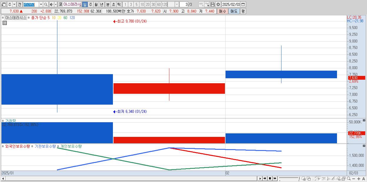 - 아스테라시스 (7,630원 ▲ 2.69% , 시총: 2,786억, 거래량: 22,769,873, 거래대금:1,886억)