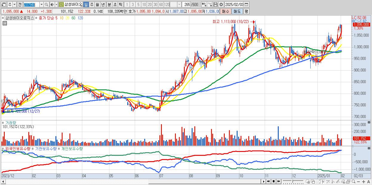 - 삼성바이오로직스 (1,095,000원 ▲ 1.3% , 시총: 779,355억, 거래량: 101,152, 거래대금:1,083억)