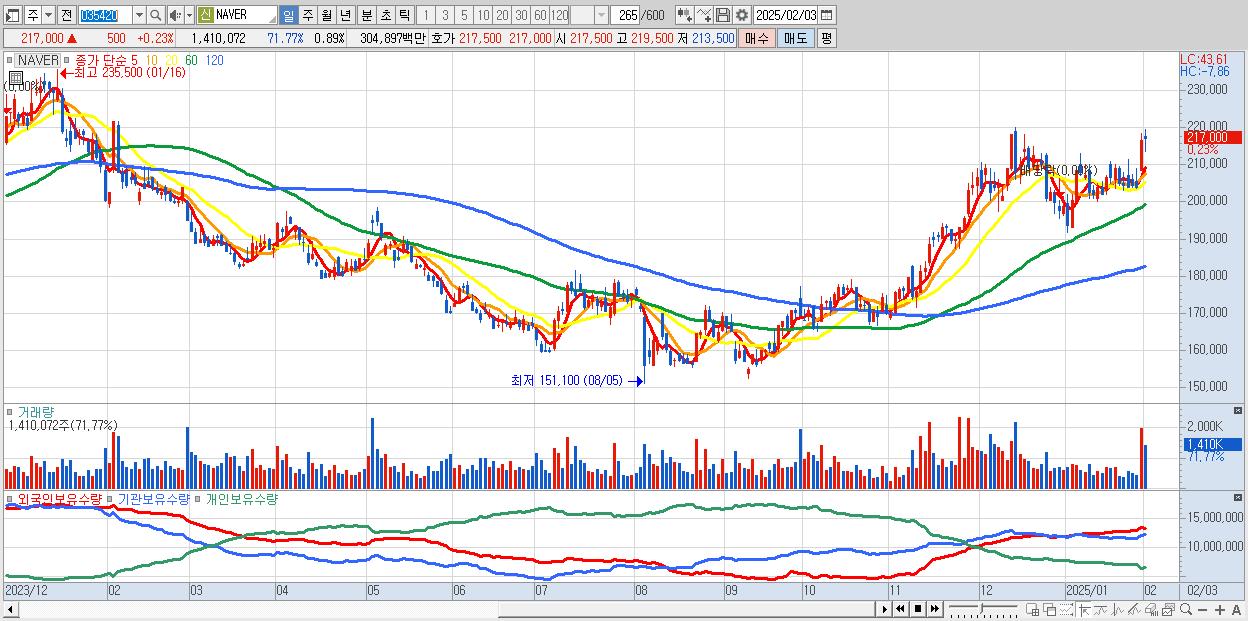 - NAVER (217,000원 ▲ 0.23% , 시총: 343,808억, 거래량: 1,410,072, 거래대금:3,049억)