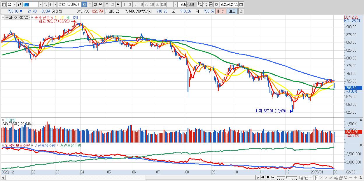- 코스닥는 기관과 외국인의 순매도하였으며 -24.49 포인트(-3.36%) 하락 하여 703.80로 마감