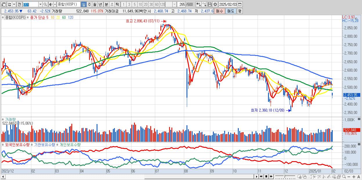 | 02/03 | 2,453.95 | ▼-2.52% | 11,220억 | -8,689억 | -3,704억 | 1,173억 |