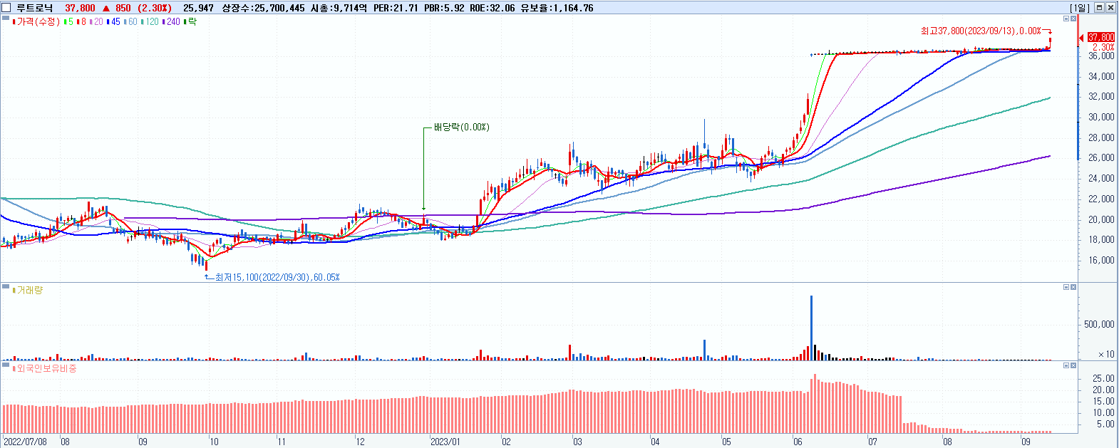 - 루트로닉 (37,800원 ▲ 2.3% , 시총: 9,715억, 거래량: 25,971, 거래대금:10억, KOSDAQ)