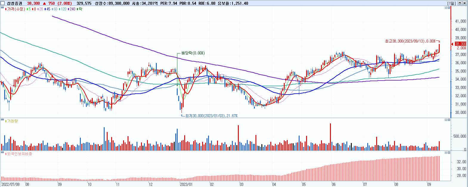 삼성증권 38,300원 ▲ 2% (KOSPI, 016360)