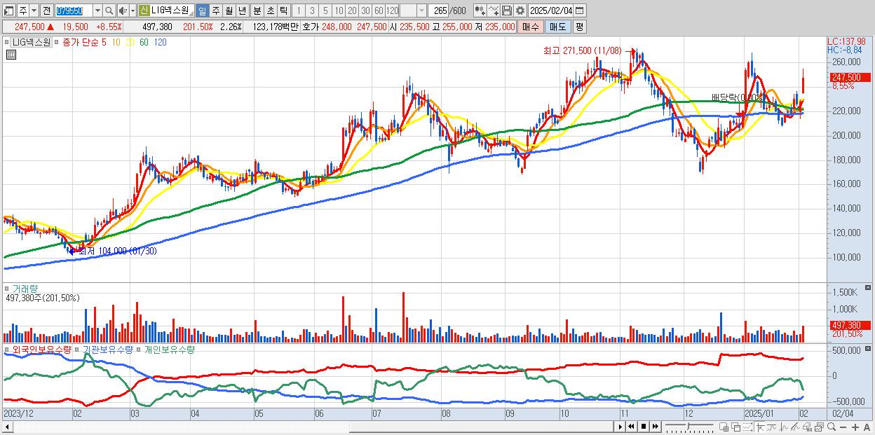 - LIG넥스원 (247,500원 ▲ 8.55% , 시총: 54,450억, 외국인 순매수 거래금:221억)