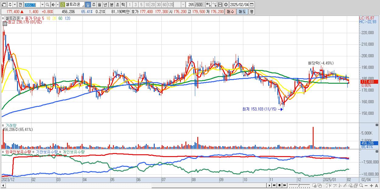 - 셀트리온 (177,400원 ▲ 0.8% , 시총: 379,754억, 외국인 순매수 거래금:59억)