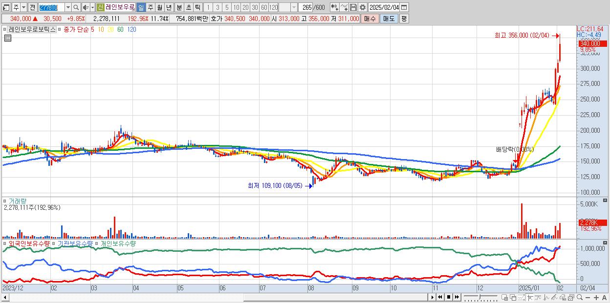 - 레인보우로보틱스 (340,000원 ▲ 9.85% , 시총: 65,960억, 외국인 순매수 거래금:253억)