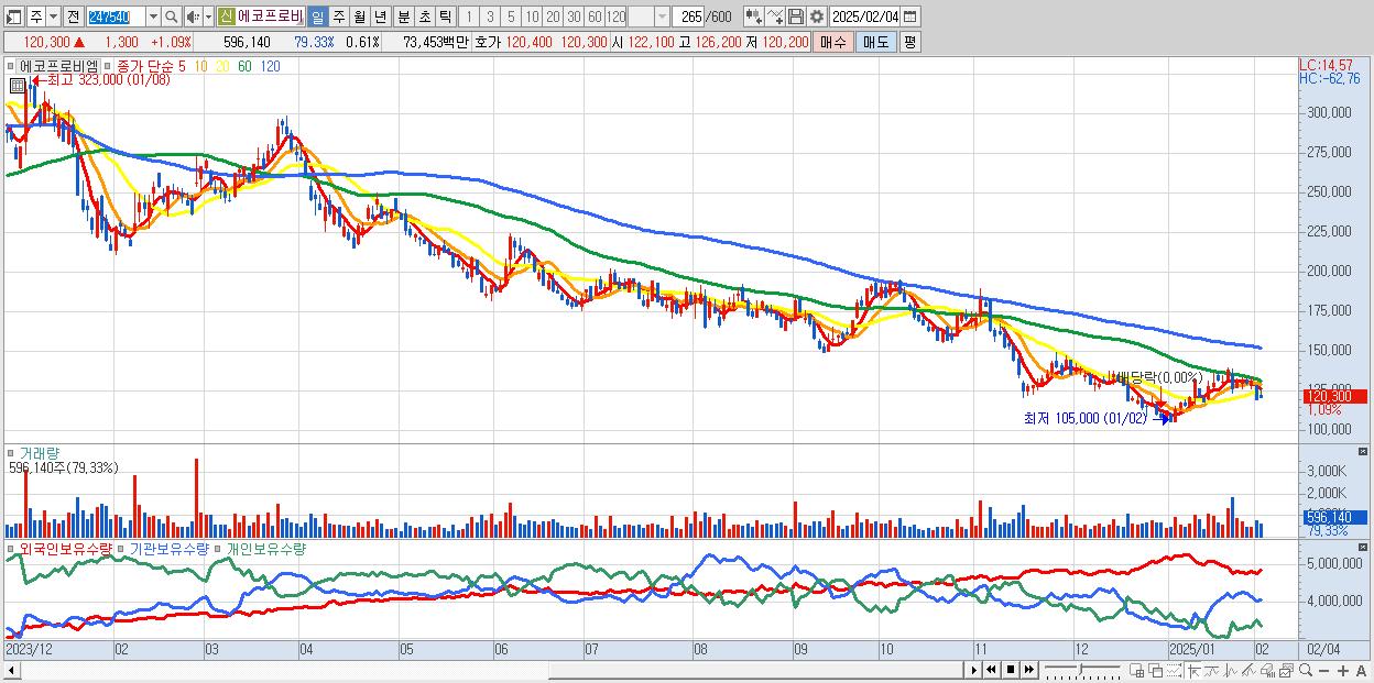 - 에코프로비엠 (120,300원 ▲ 1.09% , 시총: 117,655억, 외국인 순매수 거래금:165억)
