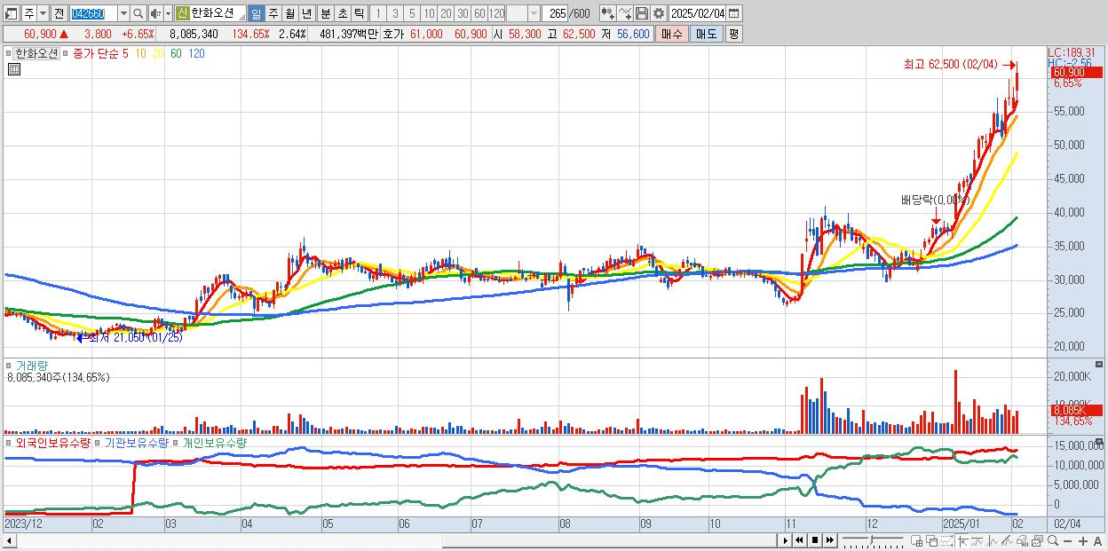 - 한화오션 (60,900원 ▲ 6.65% , 시총: 186,606억, 외국인 순매수 거래금:290억)