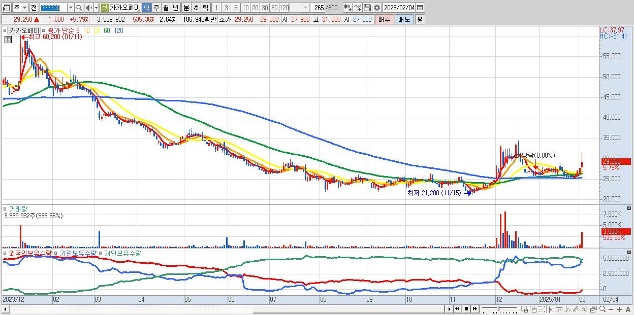 - 카카오페이 (29,250원 ▲ 5.79% , 시총: 39,381억, 외국인 순매수 거래금:105억)