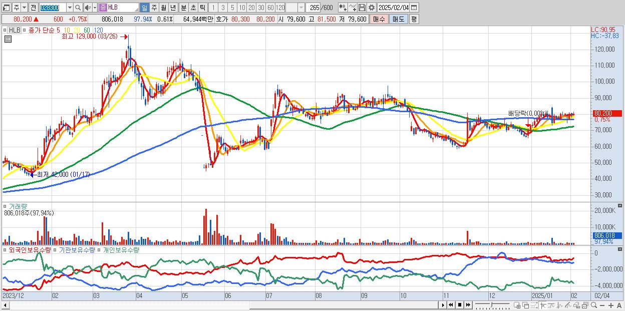 - HLB (80,200원 ▲ 0.75% , 시총: 105,373억, 외국인 순매수 거래금:154억)