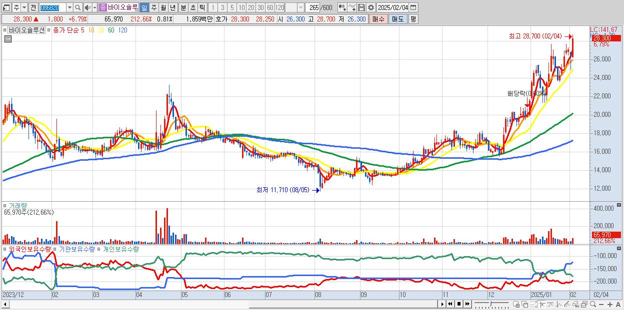 - 바이오솔루션 (28,300원 ▲ 6.79% , 시총: 2,305억, 거래량: 65,970, 거래대금:19억, KOSDAQ)