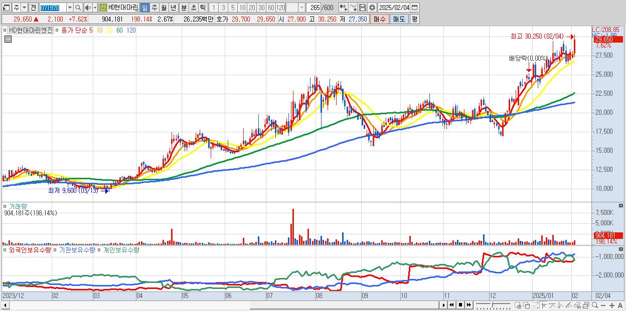 - HD현대마린엔진 (29,650원 ▲ 7.62% , 시총: 10,058억, 거래량: 904,181, 거래대금:262억, KOSPI)