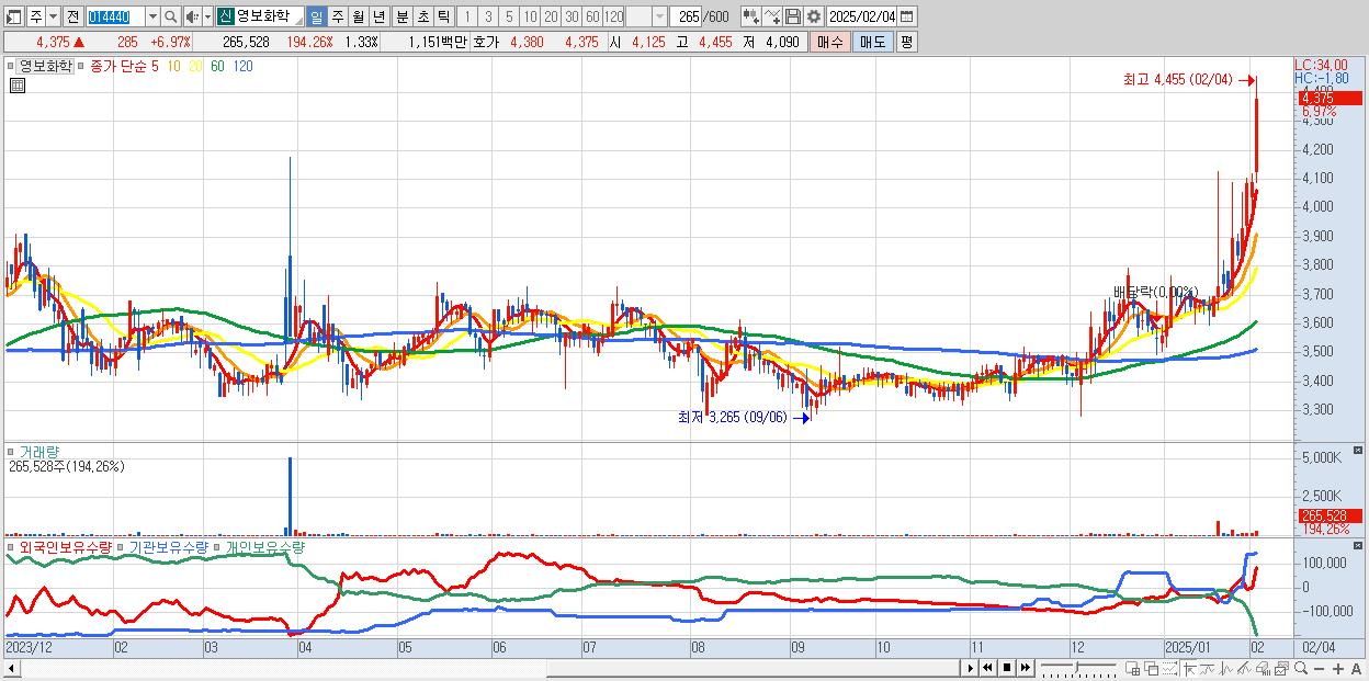 - 영보화학 (4,375원 ▲ 6.97% , 시총: 875억, 거래량: 265,528, 거래대금:12억, KOSPI)