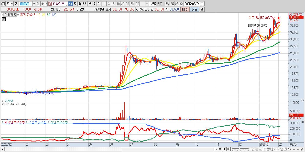 - 인화정공 (38,050원 ▲ 2.84% , 시총: 3,659억, 거래량: 21,128, 거래대금:8억, KOSDAQ)
