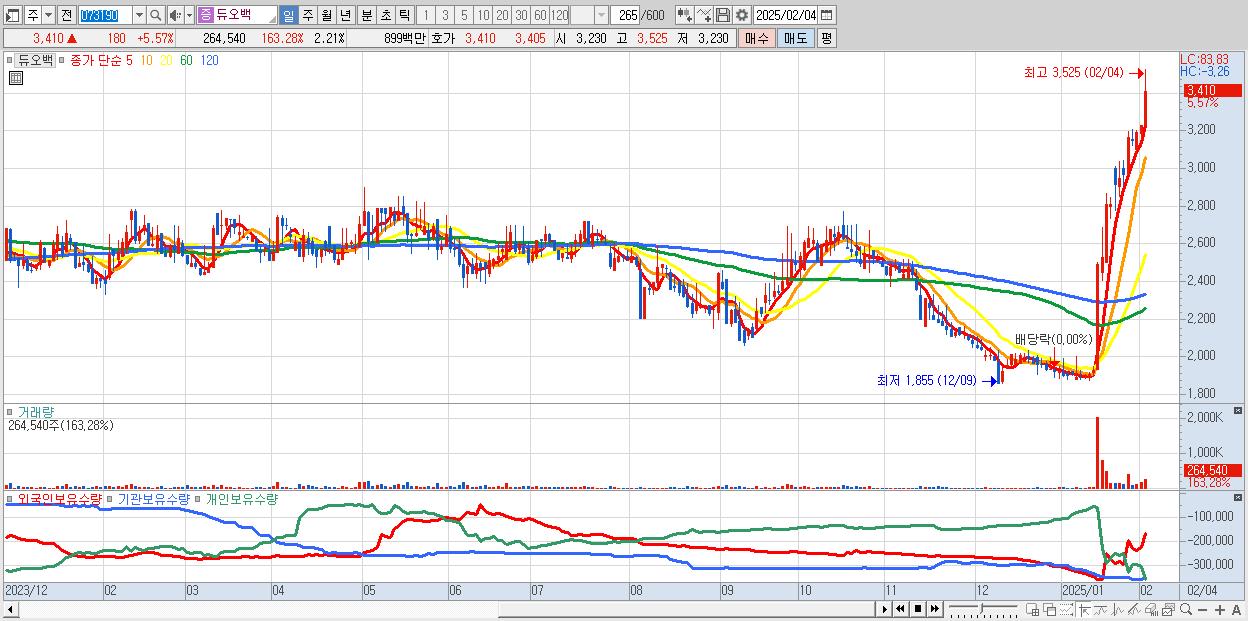 - 듀오백 (3,410원 ▲ 5.57% , 시총: 408억, 거래량: 264,540, 거래대금:9억, KOSDAQ)